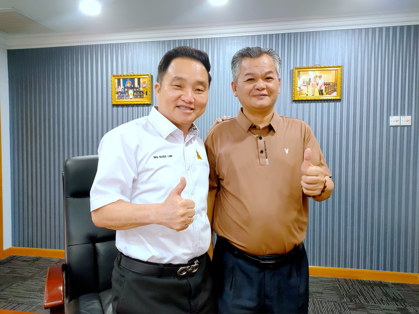 马来西亚雪兰莪州拿督黄瑞林议员(左)与中国华夏文化网总编辑、马来西亚中华传统音乐文化节联合组委会主席、泉州市艺如文化传媒有限公司总经理陈家服(右)合影▲