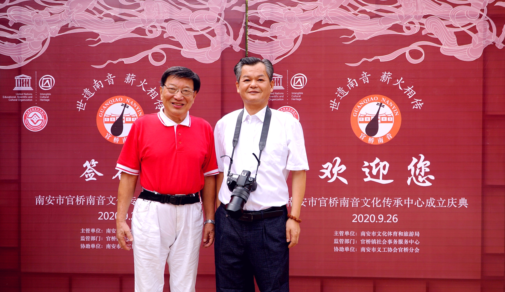 中国华夏文化网总编辑、马来西亚中华传统音乐文化节联合组委会主席、泉州市艺如文化传媒有限公司总经理陈家服(左)与广东省南音研究会会长黄朝晖(右)合影▲