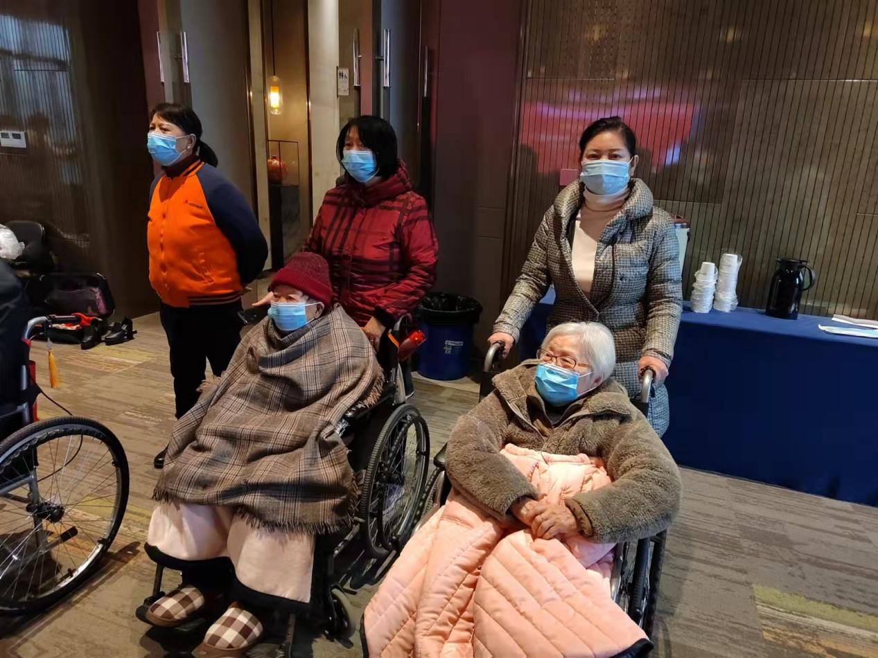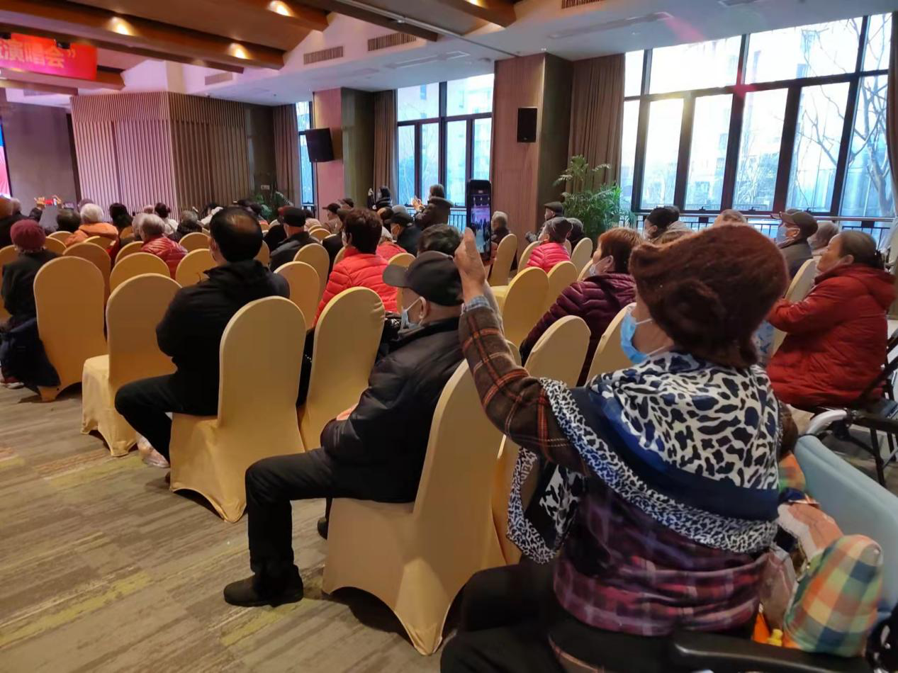 下午3点不到,老人们就在护理员、家属陪护下来到礼堂。不一会儿,老人们就坐满了座位,等待着节目的演出开始。