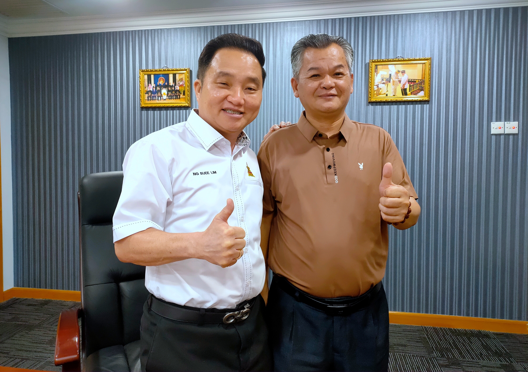 马来西亚雪兰莪州拿督黄瑞林议员(左)与原人民日报海外版香港办事处副主任编辑记者,现任香港华夏文化艺术出版社社长兼总编辑、中国华夏文化网总编辑陈家服(右)合影▲