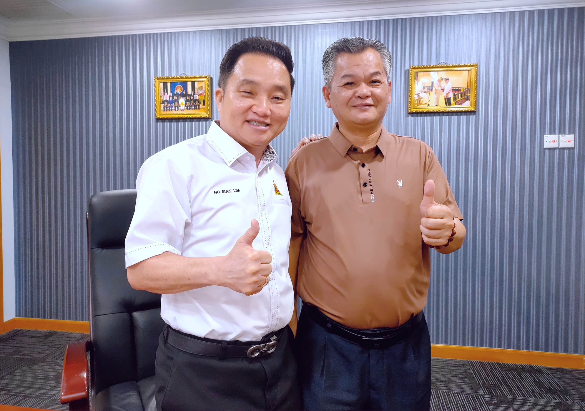 马来西亚雪兰莪州拿督黄瑞林议员(左)与马来西亚中华传统音乐文化节联合组委会主席、中国华夏文化网总编辑、泉州市艺如文化传媒有限公司总经理陈家服(右)合影▲