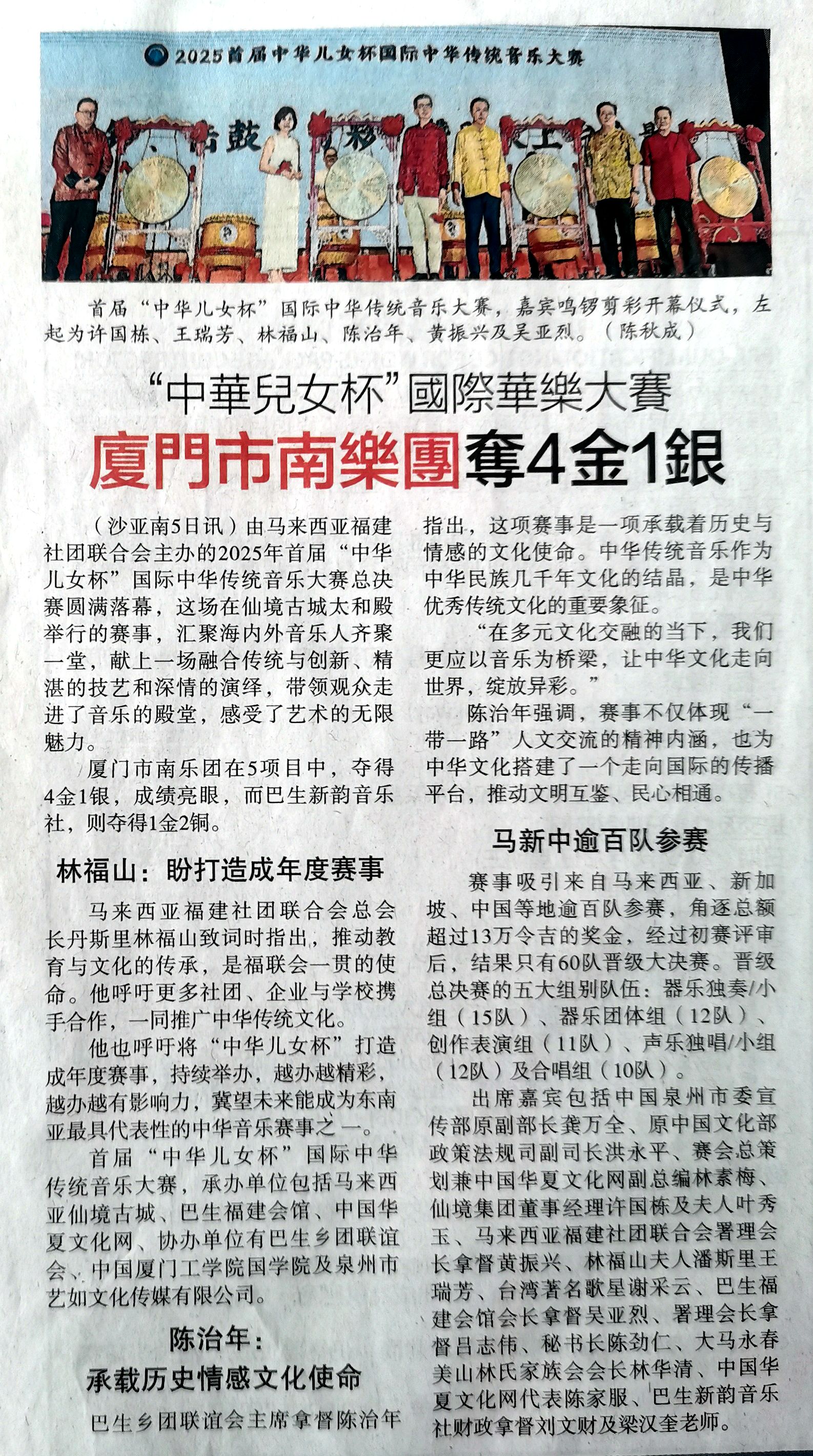 此會之立,非終點,乃新程。吾將率全體同仁,以習近平文化思想為指引,守“大道之行,天下為公”之文脈,踐構建人類命運共同體之使命。讓每段旋律皆為文化互鑒之橋,每場演出盡成文明對話之證,讓華夏雅樂於南洋大地煥發新生,為“一帶一路”高質量發展譜寫美美與共之文化華章。