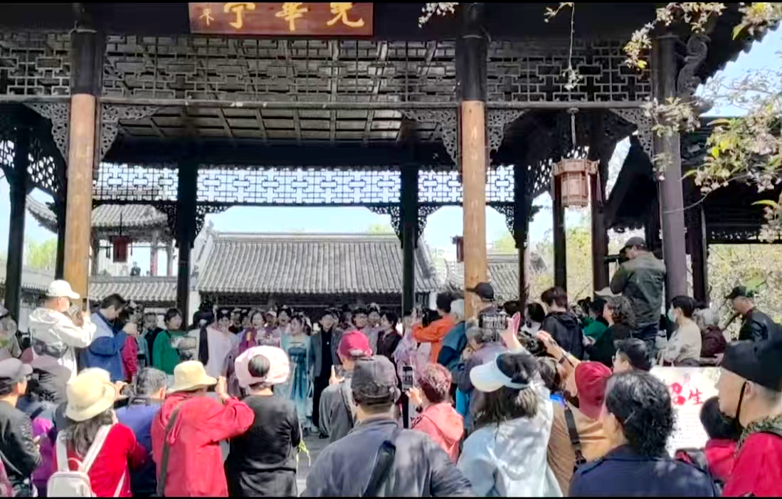 长廊内外的游客们都驻足观看,拍手叫好,仿佛”穿越”到古代,体验中华古诗词的无尽魅力,这里的快闪演出结束了,游客们还舍不得离去。