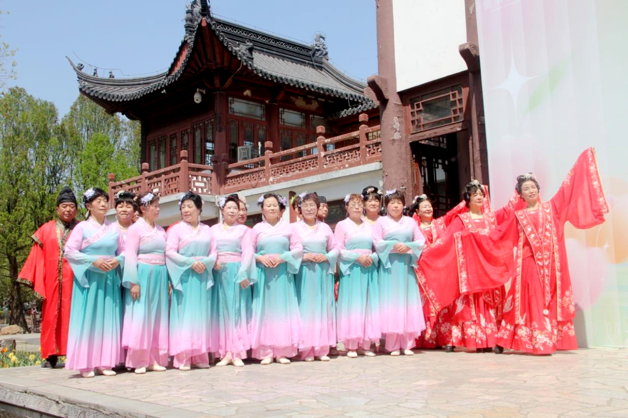 十点二十左右,飘来一群身着古装汉服纱裙的“中老年美女”,她们稳重而优雅地唱着《 金陵酒肆留别》,这是唐代诗仙李白在金陵作词,姚昆宏谱曲的一首昆歌古诗词,另一首是唐代杜牧作词辛清华作曲的《江南春》。